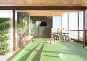 No térreo, possui um layout completo com ambientes integrados, e ao subir as escadas é possível ter uma visão panorâmica do seu entorno, com vista para a natureza, de onde se pode relaxar na banheira observando o pôr do sol, ou jogar uma partida de sinuca entre amigos.